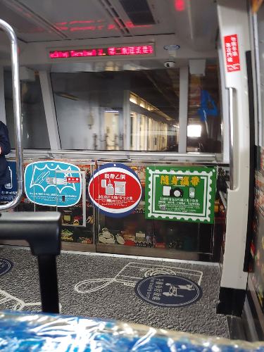 타오위안 공항에 도착 후 저는 터미널 이동을 위해 공항 내에서 운행하는 열차(?)를 탔고 내부에서 한 번 찍어봤어요. 지금 보니까 이 사진에 저를 힘들게 큰 짐의 모습이 보이네요. 약간 낑낑대며 돌아다녔던 기억이.