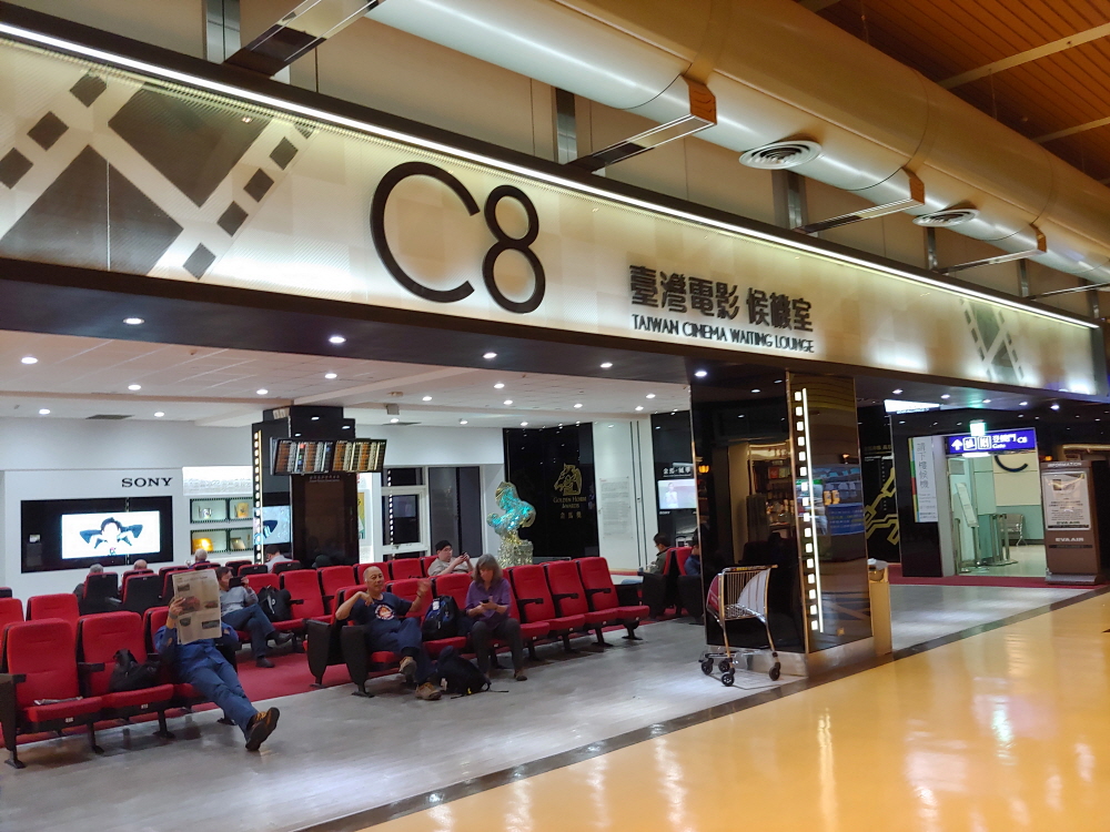 타오위안 공항 라운지 C8은 간판에서 보이는 것처럼 시네마가 컨셉. 간판이나 기둥에 표현된 필름이 눈에 띄어요.