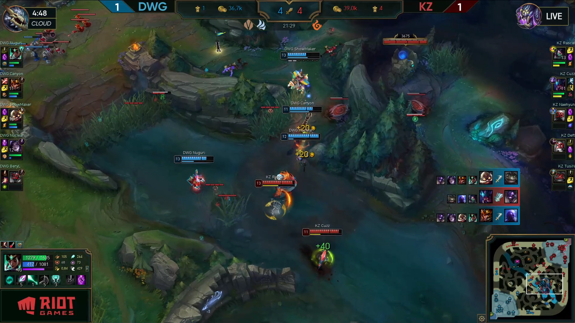 아마 솔킬을 가장 많이 딴 탑솔러가 너구리 선수일텐데 1경기 초반 그 잘하는 블라디를 잡고도 라스칼 선수에게 솔킬을 내주고만 너구리 선수였습니다. 캐년 선수가 곧바로 침착하게 만회해줬기 때문에 큰 손실은 없었지만 솔킬을 해야할 선수가 내주는 모습에 불안했습니다.