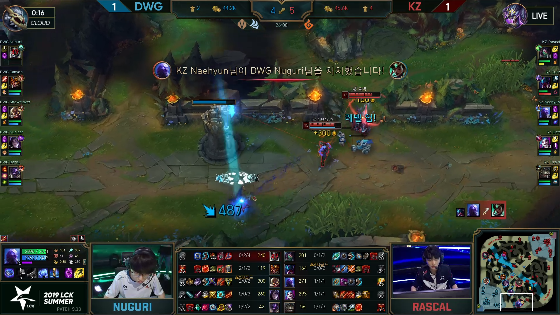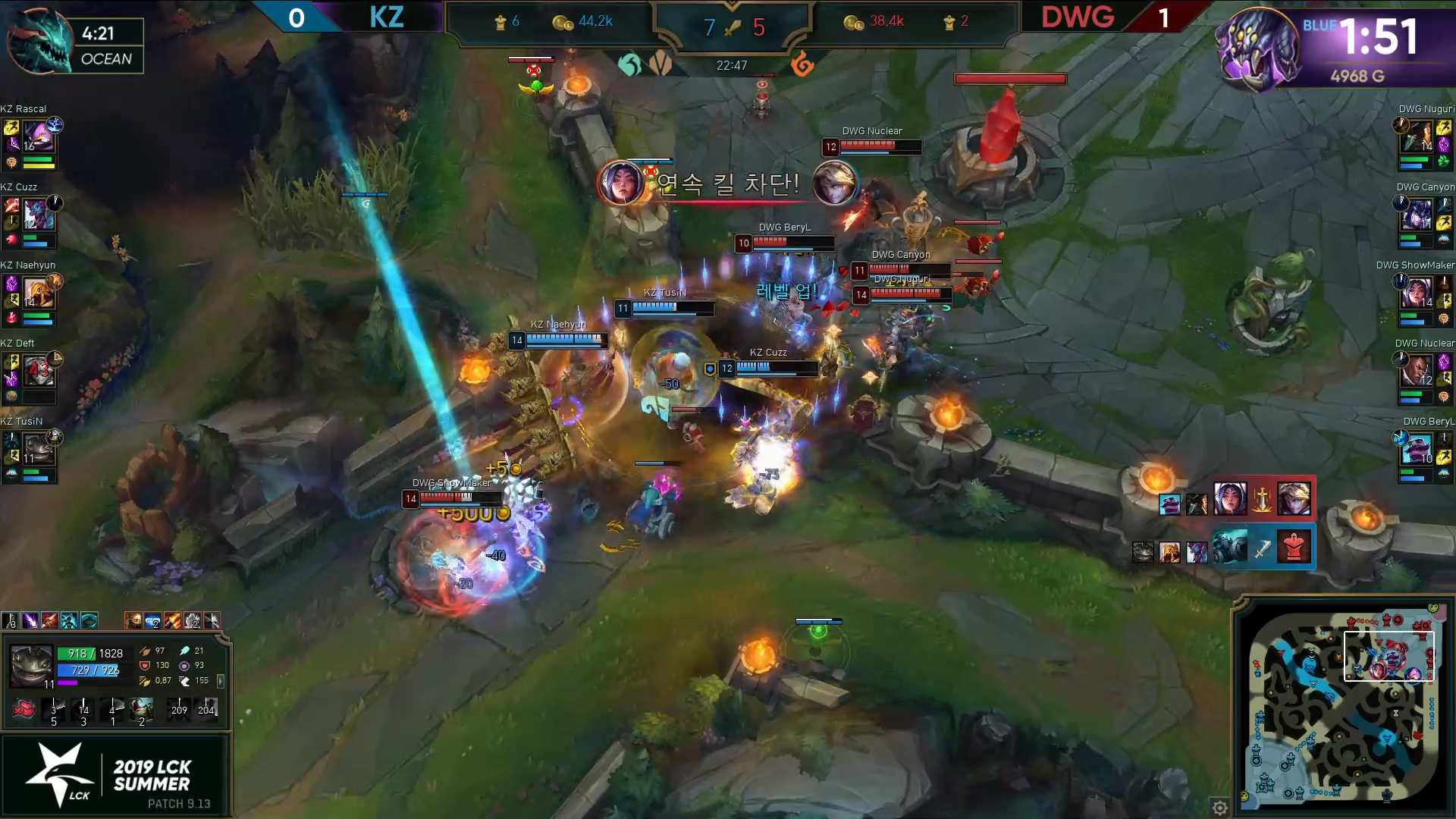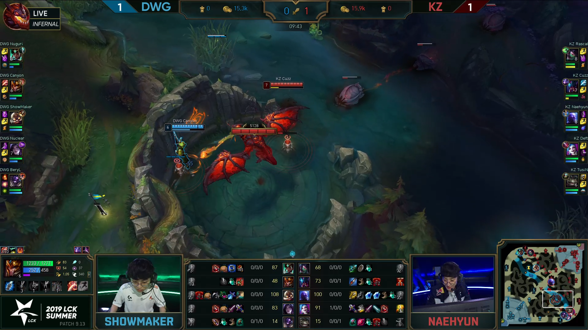 19년 7월 13일 LCK 8시 경기는 킹존 드래곤 X vs 담원 게이밍이었습니다. 리프트 라이벌즈에서 롤드컵을 제패한 IG를 이겨냈지만 가장 최근 LCK에서 조금 비틀거린 킹존과 리프트 라이벌즈에서까지 엄청난 활약을 하며 LCK 모든 팀 중 가장 기세가 좋았던 담원이었기 때문에 그래도 담원의 우세가 점쳐지는 매치였죠.