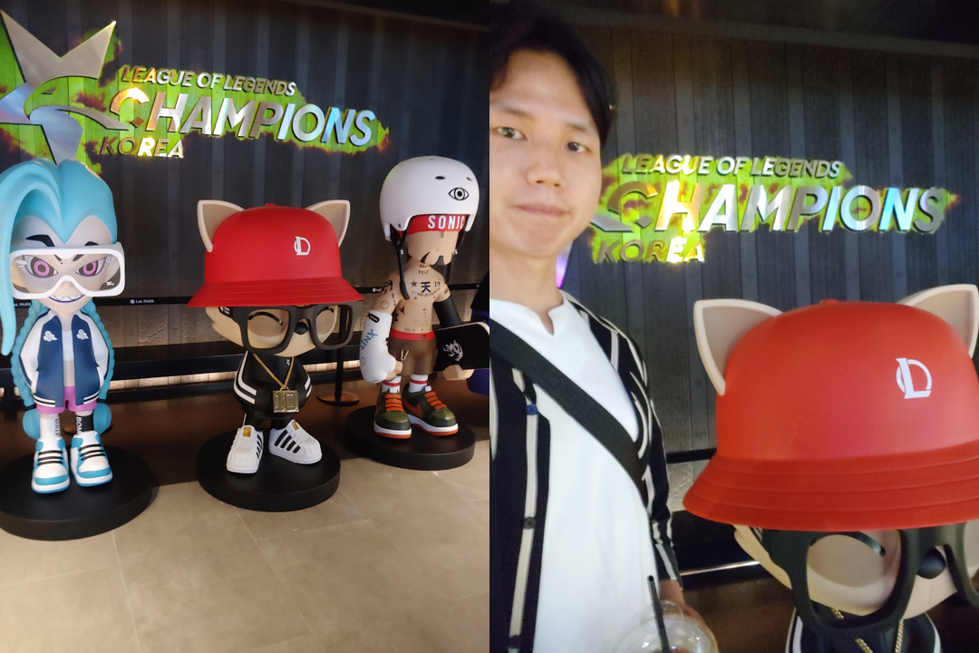 LCK 앰블럼이 빛나는 정 중앙에도 대형 아트토이들이 놓여져 있었습니다. 징크스도 귀엽지만 그래도 제 스타일은 역시 티모였기 때문에 셀카도 티모와 함께 했어요.