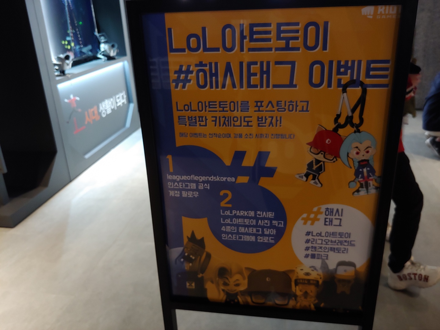 롤 아트토이 출시를 기념해 이렇게 해시태그 이벤트도 진행하고 있었습니다. 키체인은 금방 떨어지고 제가 도착했을 쯤엔 없을 것 같아 기대하지 않고 있었는데 제가 도착한 시간에도 정말 많이 남아있더라고요. 그래서 망설이지 않고 바로 이벤트에 참여했고 커여운 티모로 받았습니다.