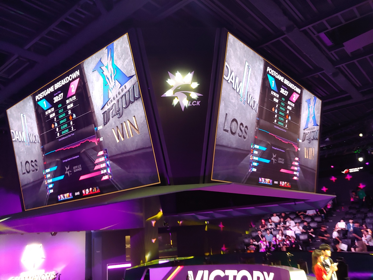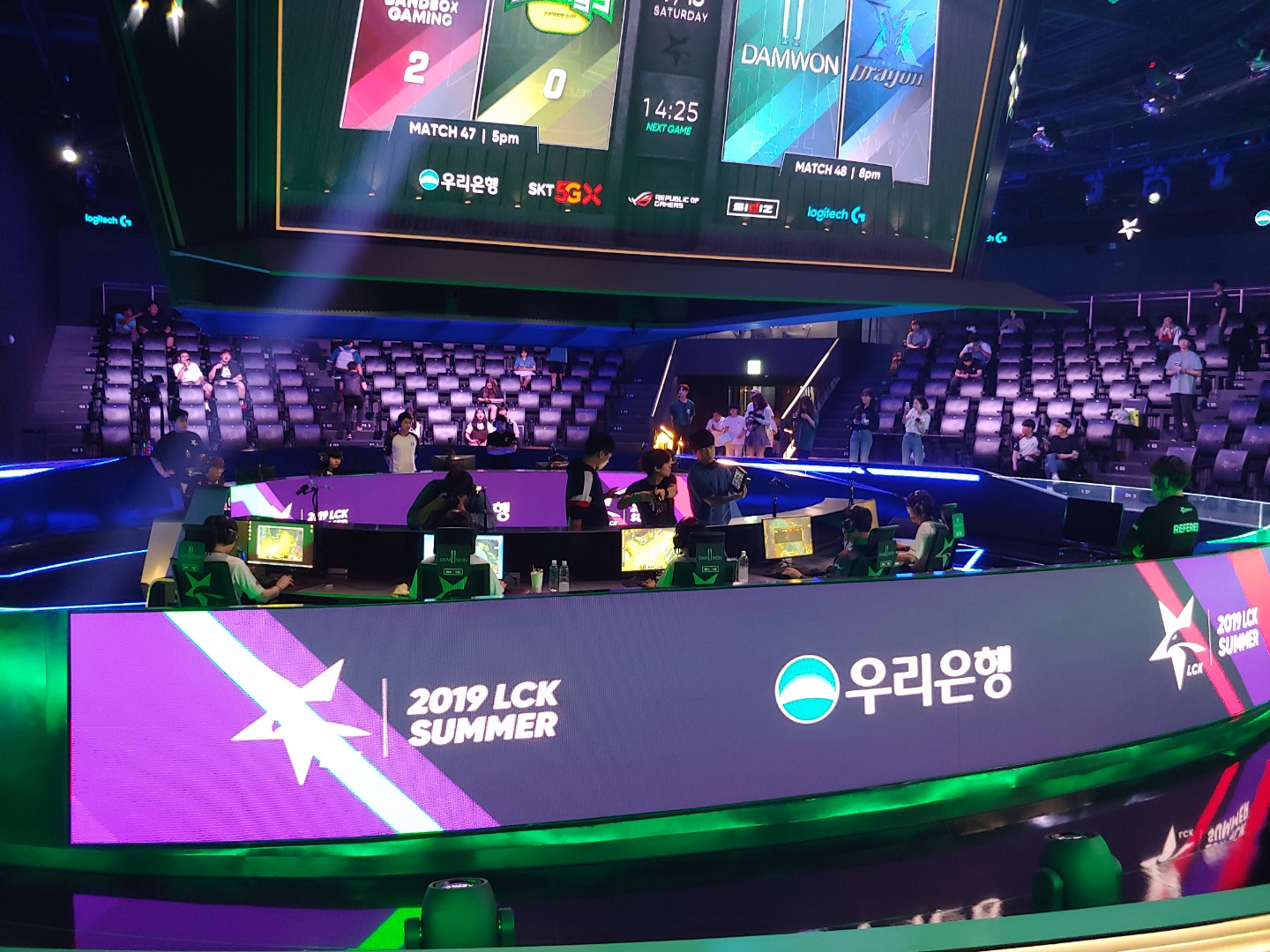 언제나처럼 경기장 바깥에는 담원 게이밍과 킹존 드래곤 X의 경기와 스코어를 알리는 빔(?)이 있었습니다. 아직은 경기 시작 전 0대0의 긴장된 상황.