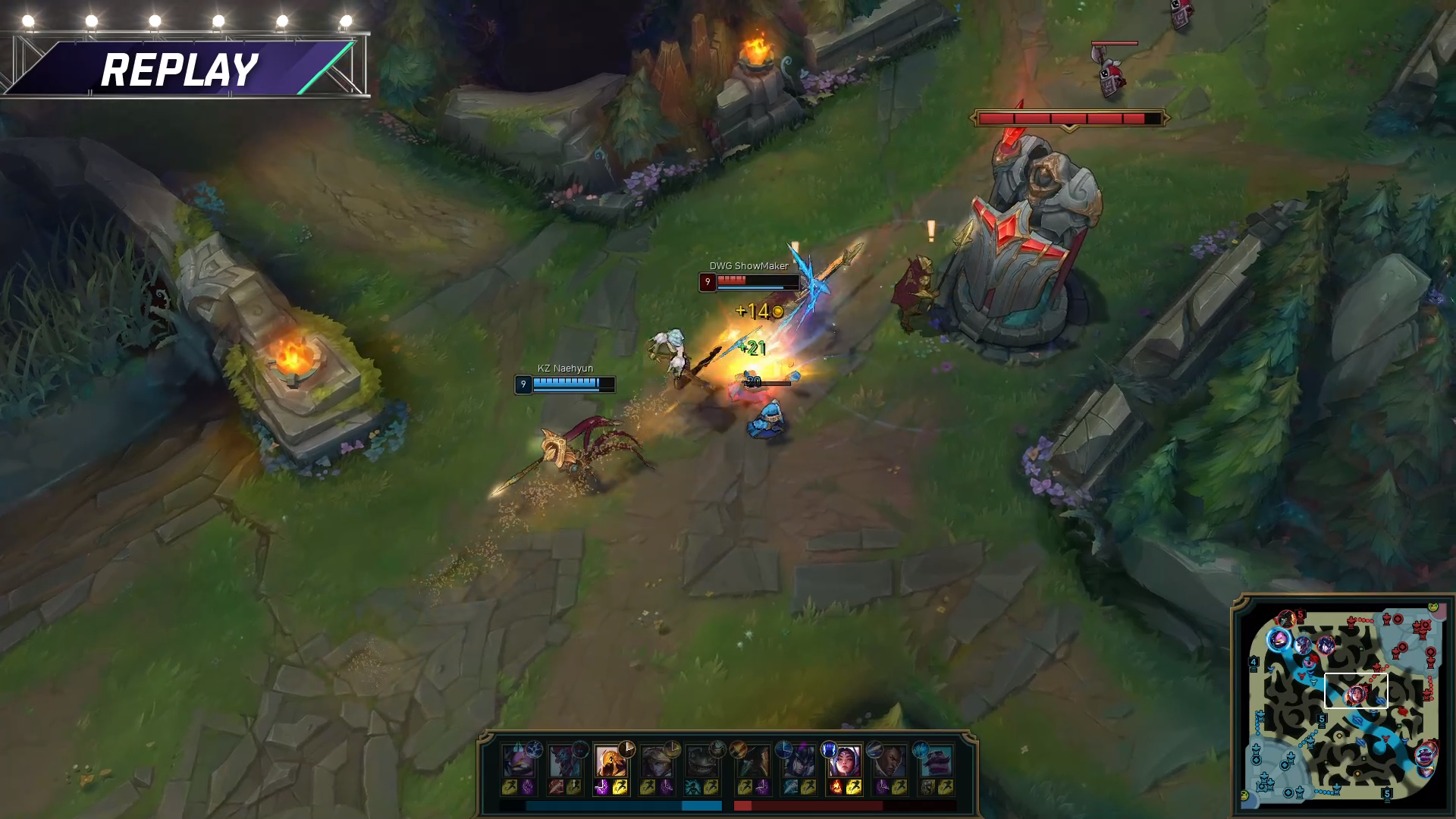 1경기에 이어 2경기도 당연하다는 듯 담원의 바텀이 크게 밀리면서 담원 입장에서 불안한 라인전을 이어가고 있었는데 쇼메이커 선수의 쇼가 시작된 순간입니다. 피가 3분의 1정도 밖에 안 남은 상태에서 귀환을 누른 상태, 내현 선수가 방해해보려고 한 번 가봤을 뿐인데 쇼메이커 선수는 이걸 킬각을 보더라고요. 관중석에서도 많은 사람들이 이 플레이를 보고 엄청 놀랐더랬죠. 언제나 느끼지만 쇼메이커 선수는 진짜 물건입니다.