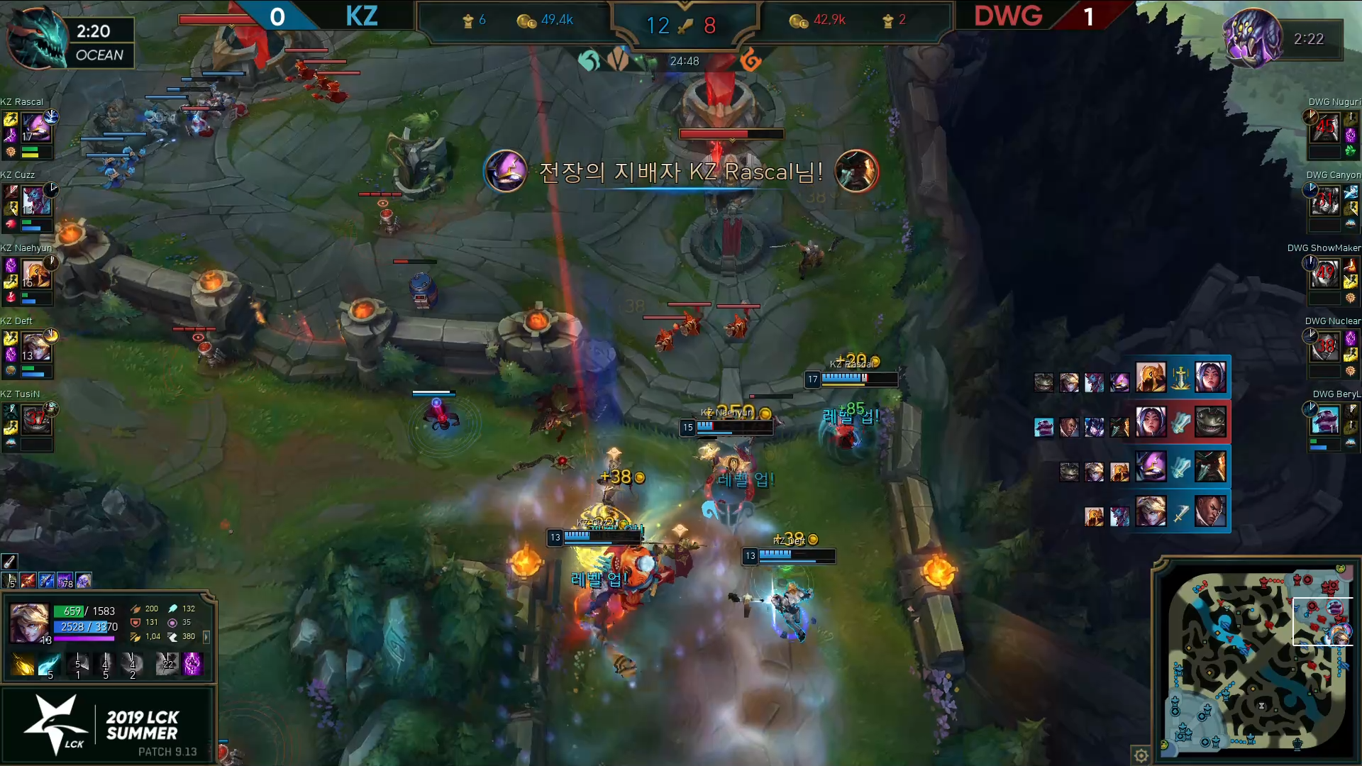 너구리 선수의 데스 이후 스노우볼이 엄청나게 굴러갔고 담원 2경기는 끝났다라는 생각만 있었는데 역시 담원은 담원이었습니다. 엄청난 무력으로 미드 억제기 근처에서 한타 승리를 가져온 것이죠. 그렇지만 에이스를 시킨게 아닌 순간 여전히 불리했던 담원이었기 때문에...