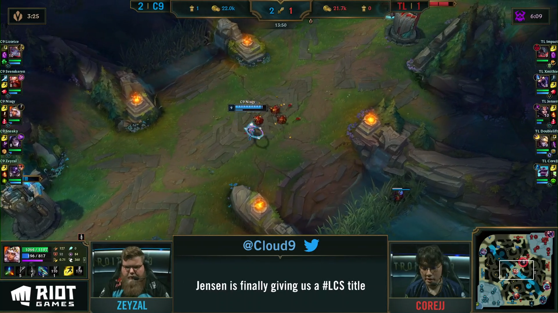 그러나 경기 내용을 보면 4경기 초반까지 Cloud9이 우승할 것만 같은 분위기가 펼쳐지고 있었습니다. 실제로 C9은 트위터를 통해 'Jesen is finally giving us a #LCS title'라고 도발하기도 했고 말이죠. 그런데 말입니다...