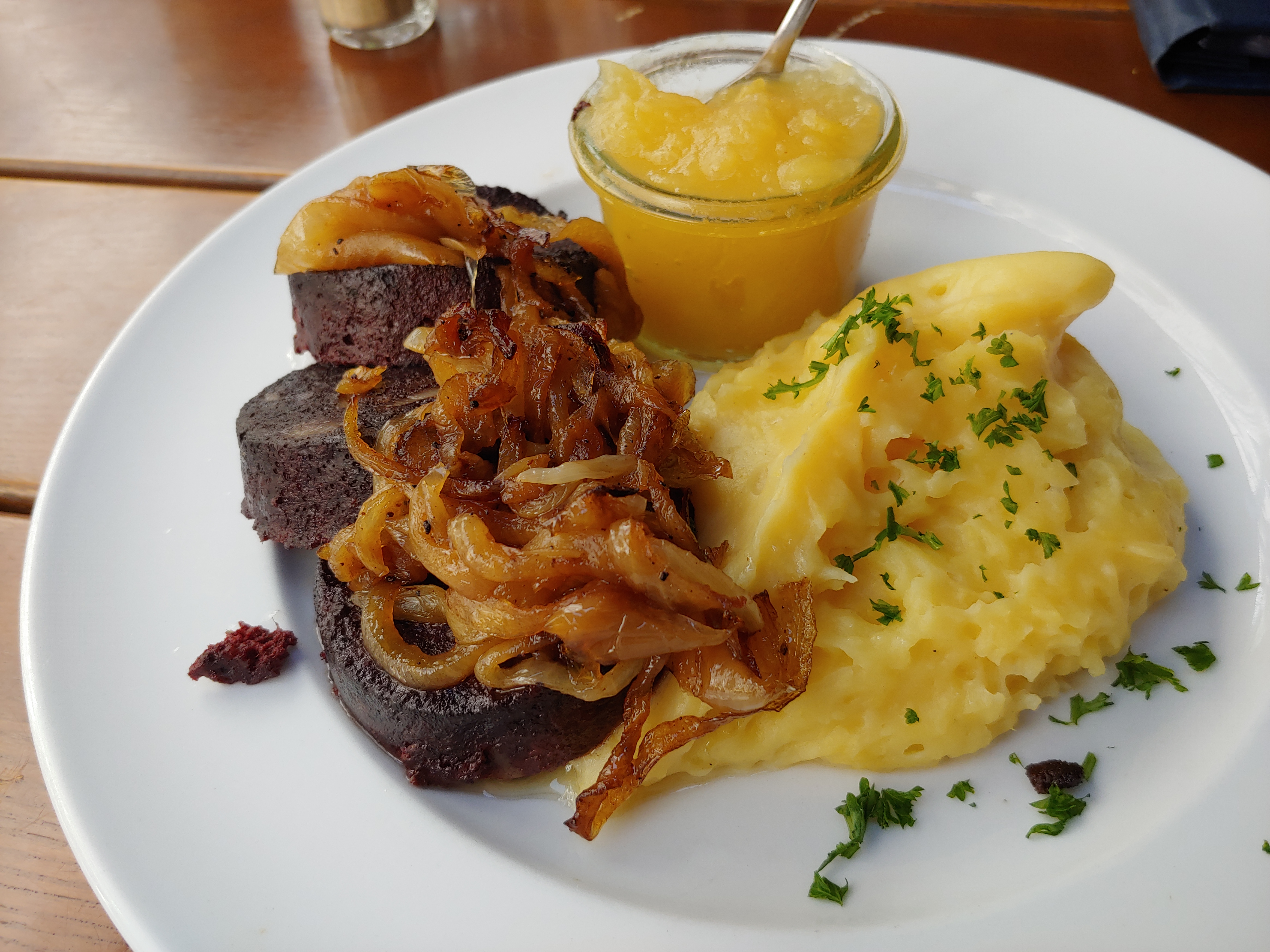 그러나 뚜둥...주문을 하고 얼마 지나서 이런 비주얼의 접시를 종업원분이 들고 제 쪽으로 오더라고요. 마음 속으로 나한테 오는게 아니길 제발!하고 빌었는데 저의 바람과는 다르게 제 앞에 놓인 블러드 소시지(Blood Sausage)입니다. 블러드 소시지의 블러드가 '피처럼 빨간' 뜻이 아니고 진짜 '피'였을 줄이야...ㅠㅠㅠ 그래도 맛있는 편이긴 했지만 먹는 내내 후회하면서 마지막에 남겼네요. ㅠㅠ