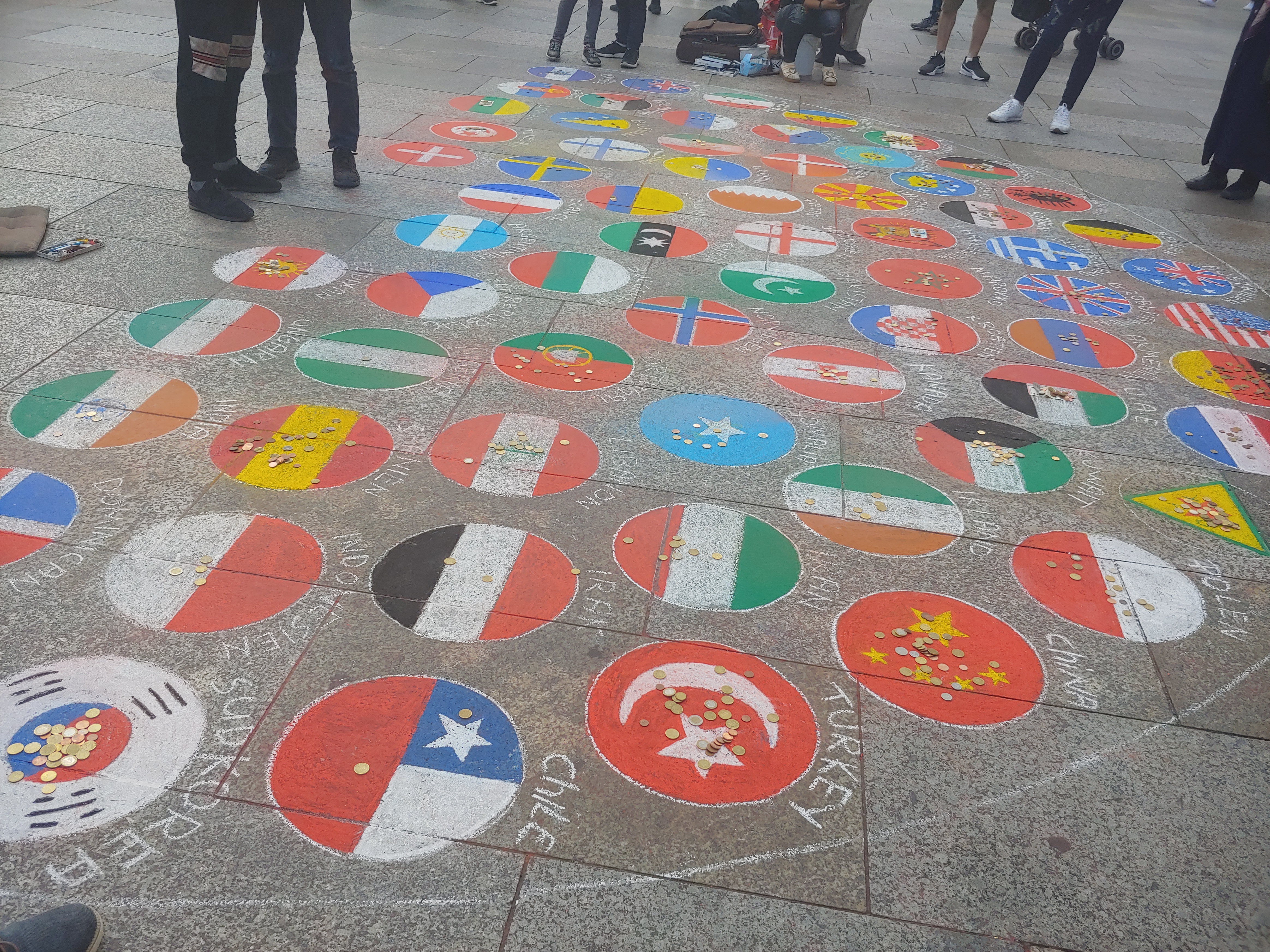 이제 이 날 하루를 마무리 하러 쾰른역이 위치한 쾰른대성당으로 오니까 애국마케팅의 현장이 펼쳐졌습니다. 예술가(?) 한 분이 주변 사람들한테 어느 나라 사람이냐고 묻고는 이렇게 국기를 그려지는 형식이죠. 구경하던 사람들이 자신이 소속된 국가의 국기에 동전을 던져놓곤 했는데 저는 사우스 코리아를 보고도 그냥 지나쳤습니다 헤헤. 사우스 코리아가 돈이 많은 편인걸 보고 살짝 뿌듯해 했는데???