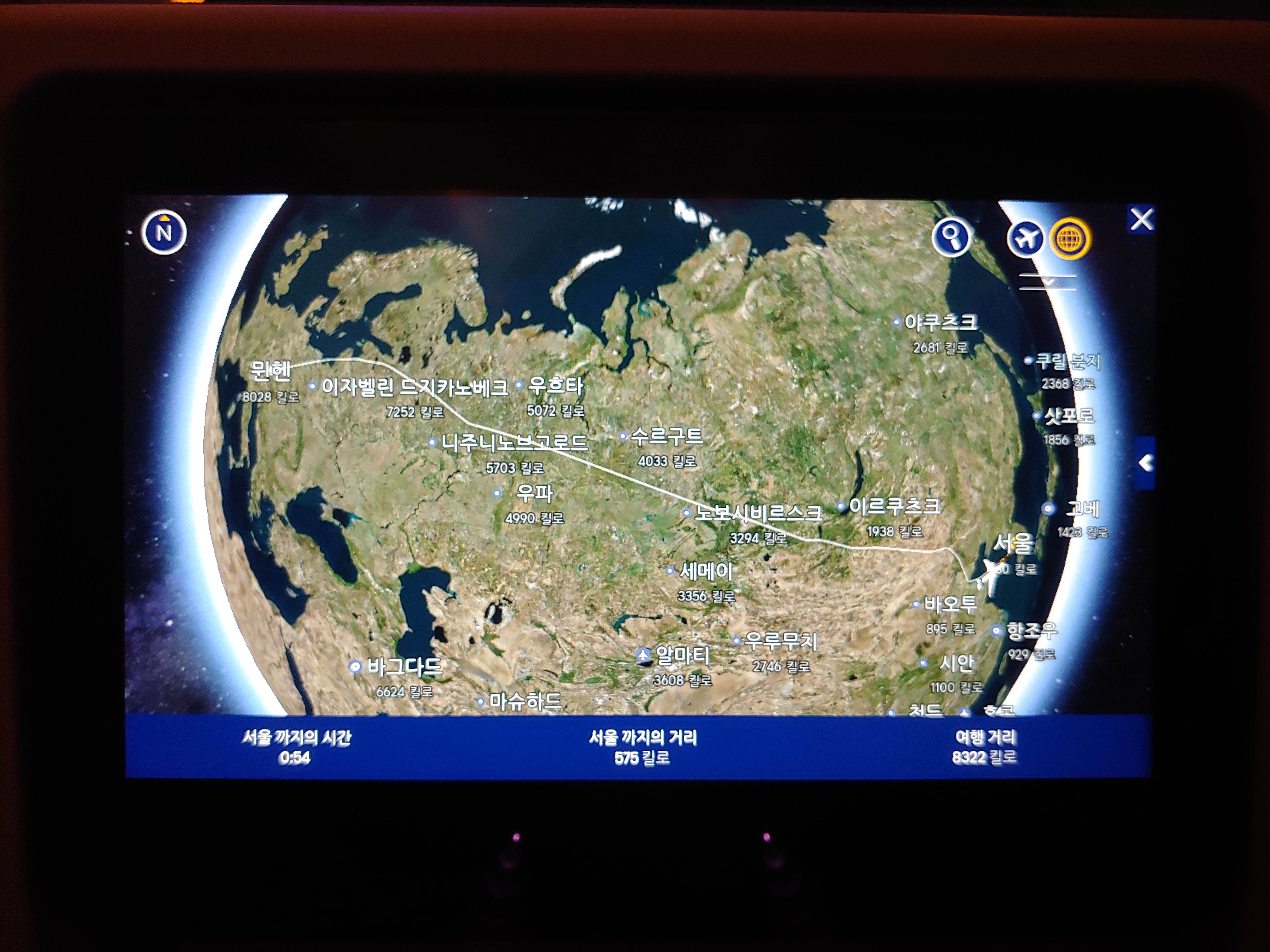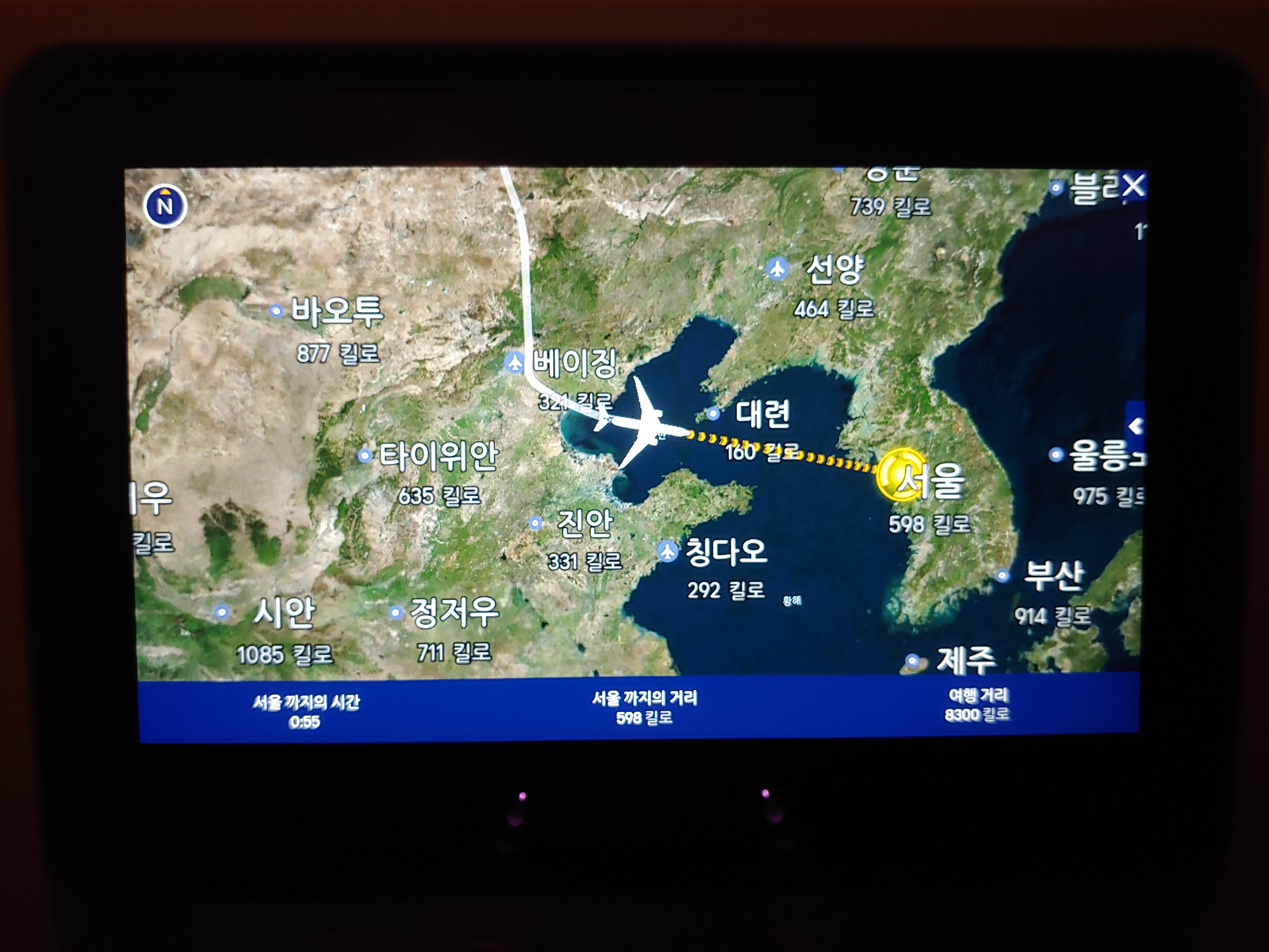 10시간이 넘는 비행 끝에 서울 도착이 얼마 남지 않은 상황에서 서울 도착 실화냐?라는 생각과 함께 찍은 사진입니다. 이 때는 정말 얼마 남지 않은 모습을 보면서 믿고 싶지 않았어요. ㅠㅠ