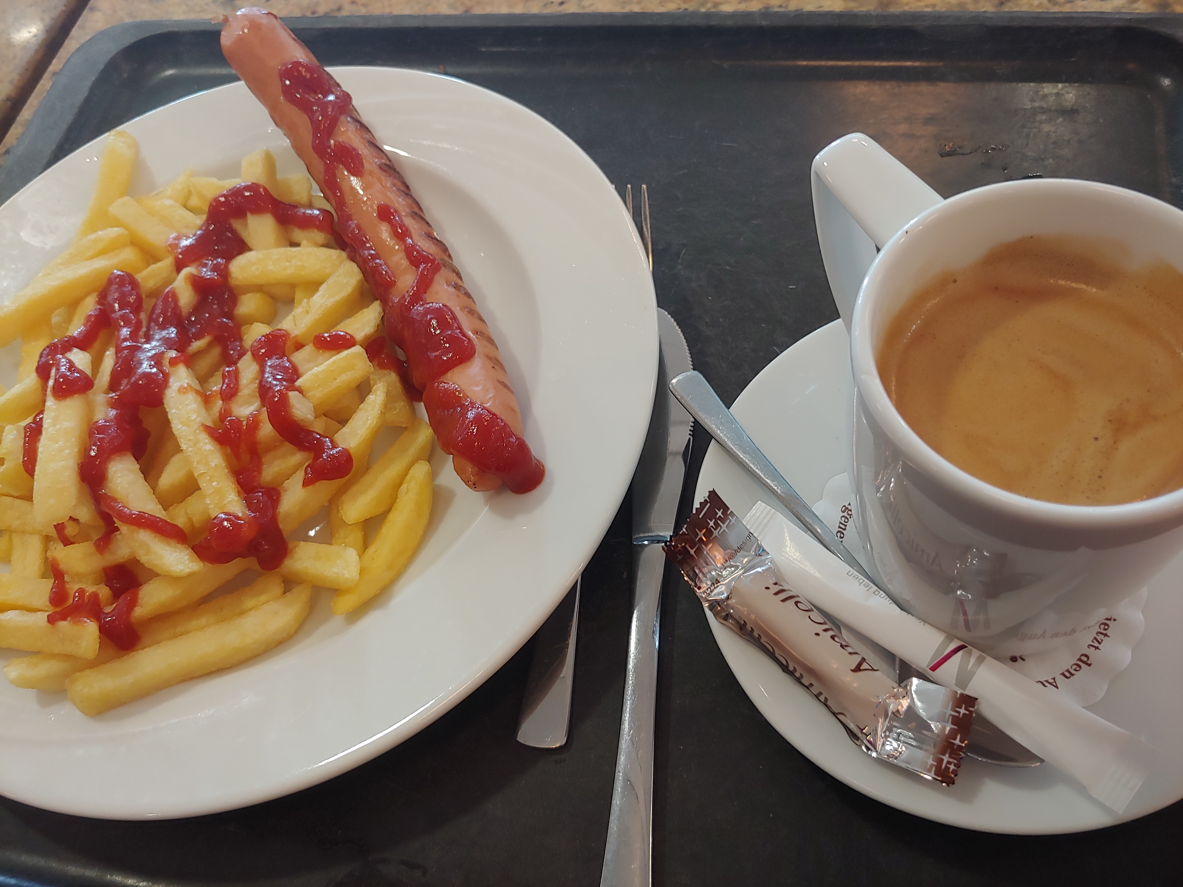 뮌헨 공항에 도착해서는 여유가 조금 있었는데요, 뭘 먹을까 한참 고민하다가 역시 마지막이니까 독일스러운 음식을 먹고 싶었습니다. 음식으로는 소시지를 선택했고 음료를 맥주로 할까? 살짝 고민했지만 아무리 독일에 있는 저라도 아침부터 맥주는 살짝 부담스럽길래 어울리지도 않는 뜨거운 커피를 시켰어요. 함께 받은 초콜릿은 맛있었고 커피도 나쁘지는 않았지만...어차피 마지막인데 그냥 맥주 마실걸 하는 후회를 남겼습니다.