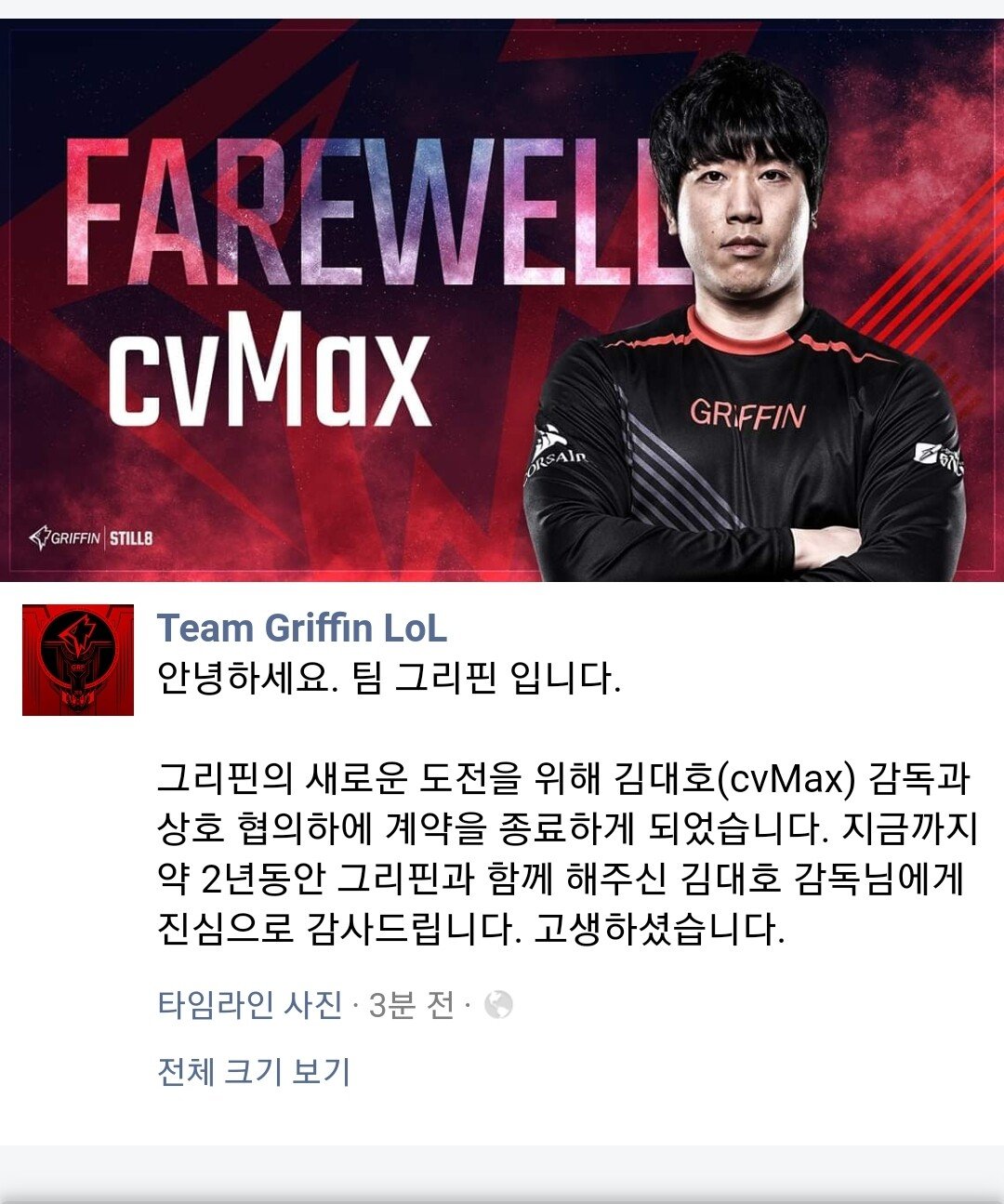 그리핀의 씨맥(cvMax) 김대호 감독 계약해지 발표가 있었던 날은 퇴근길 지하철 안에서 인터넷을 하고 있었는데 이 소식을 보고 물음표만 가득했습니다. 제가 자주 이용하는 PGR21 사이트에서도 당연히 물음표만 가득한 상황이었고요.