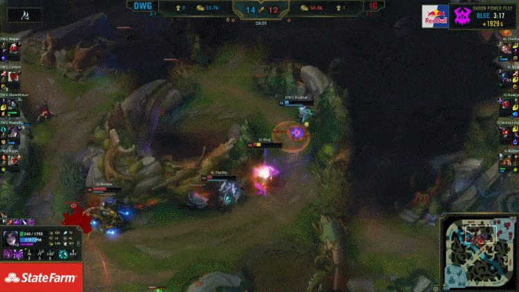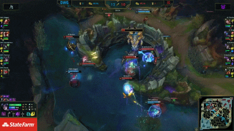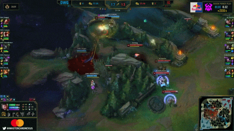 담원과 IG 경기에서 중요했던 장면 중 하나인 바론 한타입니다. 베릴 선수의 레오나가 짤리면서 담원 입장에서는 진짜로 위험한 상황이었는데요, IG의 판단미스라 생각되는 딜 중지, 뉴클리어 선수의 대담한 진입, 쇼메이커와 캐년 선수가 함께 만들어낸 바론 스틸까지 모두 맞물리면서 명장면이 나왔습니다.