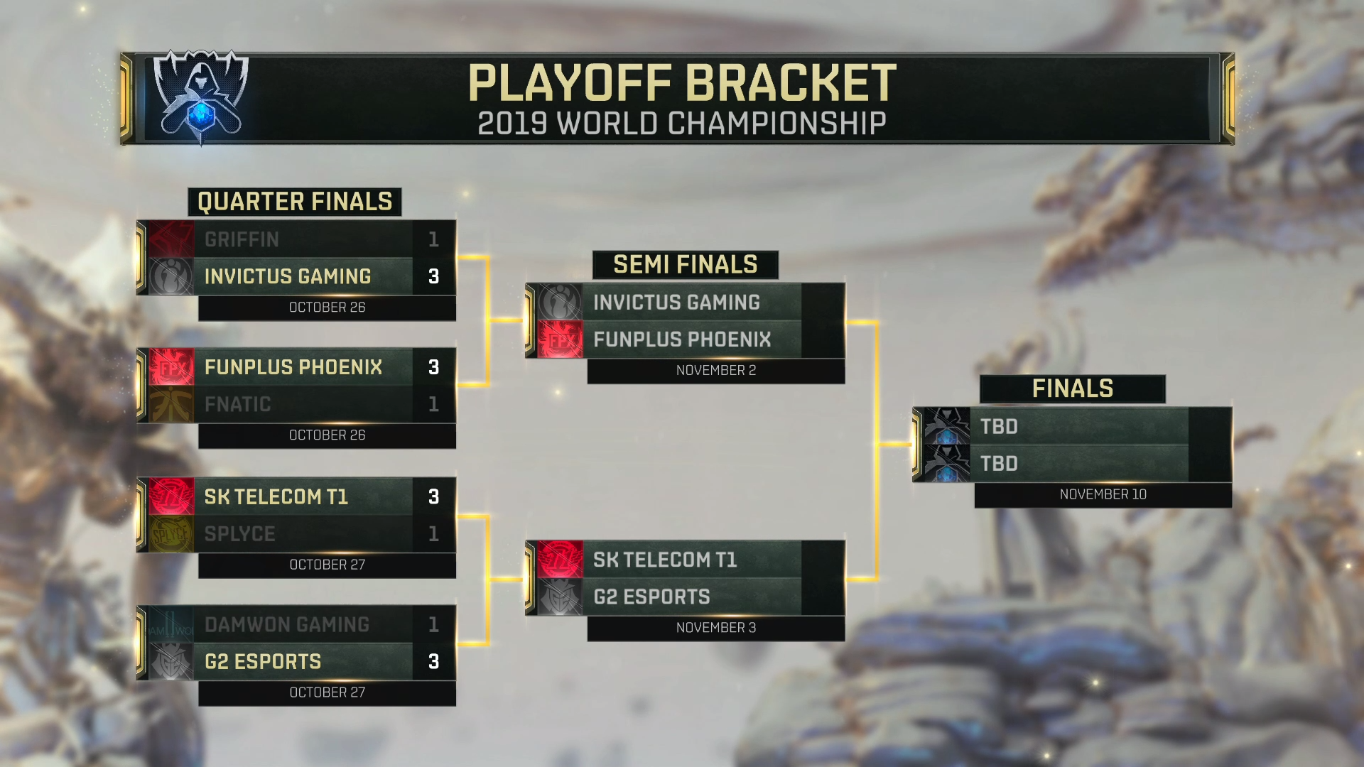 2019 LoL 월드 챔피언십 플레이인 스테이지가 시작된 것이 바로 엊그제 같은데 어느새 네 팀만 남았습니다. 그 주인공은 LCK의 SKT T1, LEC의 G2, LPL의 펀플러스 피닉스(FunPlus Phoenix)와 IG(Invictus Gaming)입니다. LPL에서는 누가 결승에 올라갈지는 몰라도 진출을 이미 확정지었기 때문에 부러워요.