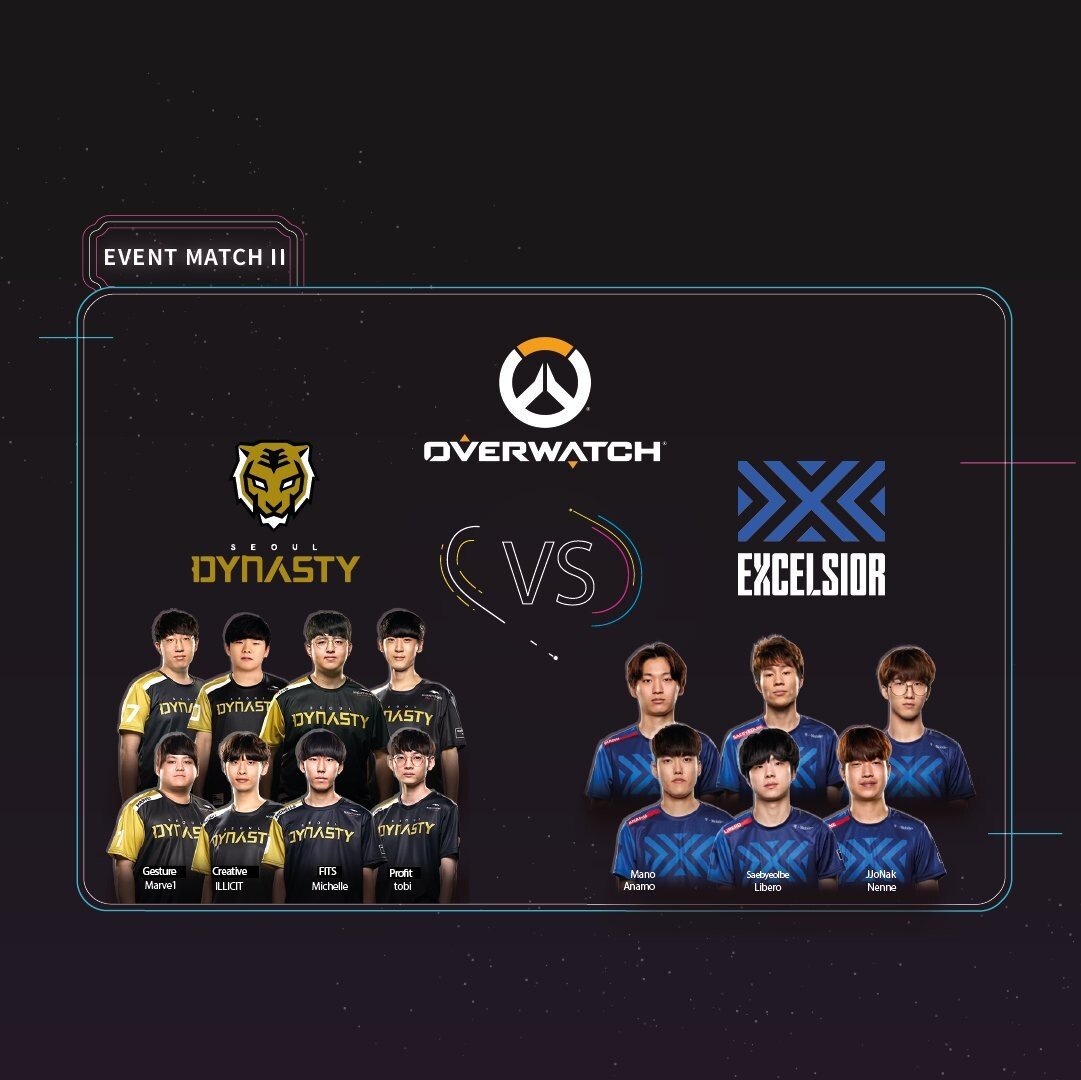 서울 다이너스티(SeoulDynasty)와 뉴욕 엑셀시어(New York Excelsior)의 이벤트 매치도 펼쳐질 예정입니다. 이적을 앞두고 있는 옵치 최애 류제홍 선수ㅠㅠ가 빠져서 개인적으로 너무 아쉬운 서울 엔트리지만 그래도 새롭게 합류한 제스처(Gesture)와 프로핏(Profit) 선수, 재계약에 성공한 토비(Tobi) 선수와 기존 선수들이 보여줄 멋진 모습이 기대됩니다. 역시나 조금 허전해 보이는 뉴욕도 이벤트전인만큼 함께 즐겨주었으면 해요~