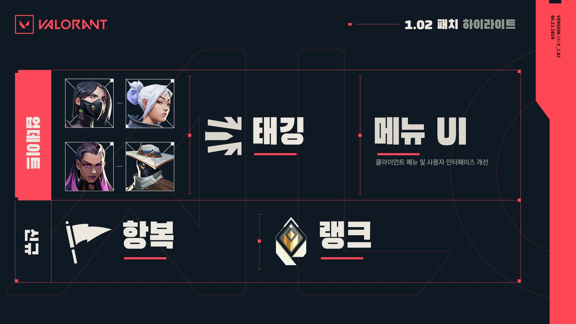 발로란트 한국서버 기준, 금일(24일) 오전 10시부터 v1.02 패치가 적용됐습니다. 특히 모든 발로란트 유저들이 기다리고 있던 경쟁전을 도입한다는 소식에 저 역시 기대했는데...경쟁전 빼고 업데이트 됐네요. 공식 트위터에서 밝힌 바에 의하면 몇 가지 버그 때문에 수정 후에 열겠다고 하고, 하루나 이틀을 예상하지만 확정은 아니라고 하니 참고하면 될 것 같습니다. v1.02 패치노트 하이라이트 영상 이번 1.02 패치를 맞이하여 발로란트 유튜브 채널에서는 패치노트 하이라이트 영상을 공개하기도 했습니다. 발로란트를 재미있게 즐기고 있다면 영상 한 번만 봐도 이해하기 좋을 것 같아요. 이번 패치에서 가장 관심이 가는 것은 신규로 도입되는 경쟁전과 항복 기능이었는데 계속 아쉬워요. 우선은 항복이 생기는 것만으..