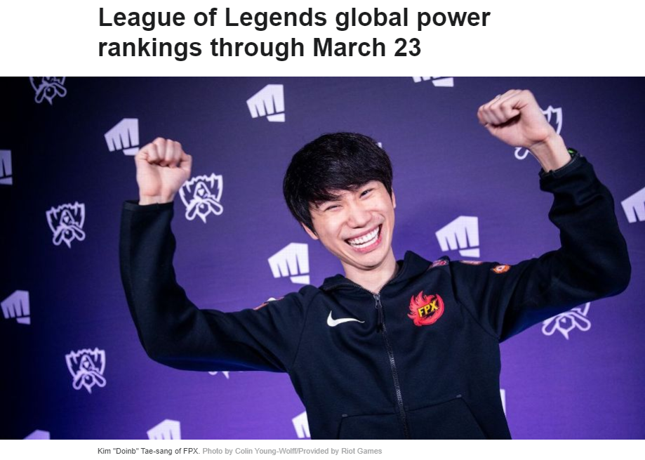 온라인으로 진행할 수 있는 e스포츠의 장점! 코로나 이슈로 전 세계적으로 종목을 가리지 않고 대회 중단 상태지만 리그오브레전드 대회는 잠시의 준비 시간을 가진 이후 계속됩니다. 리그 재개와 함께 ESPN 랭킹도 이어지고요. 3월 23일까지 ESPN 선정 리그오브레전드 글로벌 파워랭킹 1위에는 G2가 올랐는데 아직은 리그 재개 시점, 순위 반영 타이밍 등이 꼬인 상태라 맛보기 순위 정도로 생각되고 LCK까지 합류하는 다음 주를 기다리면서 이번 순위를 살펴봅니다. 3월 23일까지 ESPN 선정 리그오브레전드 글로벌 파워랭킹 1위는 G2가 차지했지만 최근 폼을 보면 작년 롤드컵 챔피언인 FPX, 특히 도인비 선수가 엄청나죠. 덕분에 이번 랭킹에서 메인으로 뽑힌 것 같습니다. 롤드컵 디펜딩 챔피언의 미소! 랭킹..